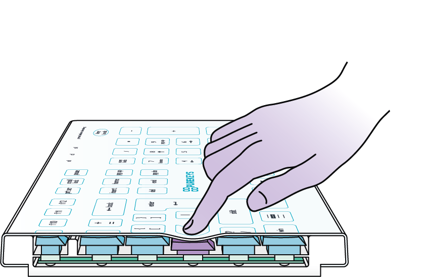The top layer of a Purekeys keyboard is made from high-quality silicone. Beneath this flexible layer are keys that provide the familiar tactile feedback of a traditional keyboard, ensuring a comfortable typing experience.